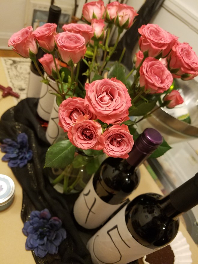Of course, you can’t have drinks without eats. We kept it light and did snacks instead of a full meal menu. We had so much chocolate. I made chocolate covered strawberries and chocolate covered pretzels. There was Columbian dark chocolate and some even more delicious dark chocolate with caramel and sea salt from Trader Joe’s. Plenty of Ghirardelli milk choclate squares and a bunch of dark chocolate covered cherries. Red wine and chocolate mix great and it was delightful.