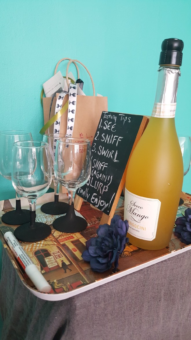 When people arrived, I started them off with a Mango white wine. Everyone got a small tasting glass of their own to use then take home. I made the bottoms with chalkboard paint and had people write their names with a cool white paint pen. When they left, everyone took home in a gift bag with a cute little magnet about wine. I used a “It’s wine o’clock somewhere” stamp I found at Michaels to decorate the gift bags in a red wine stain dye.